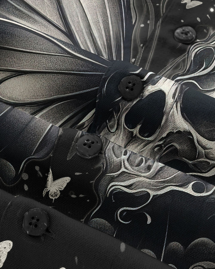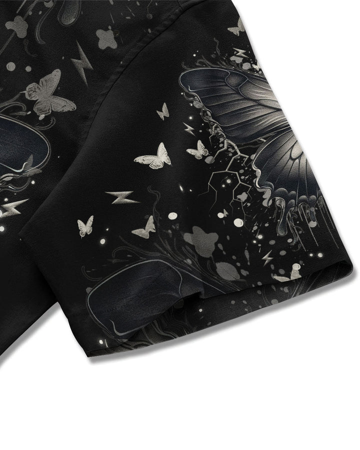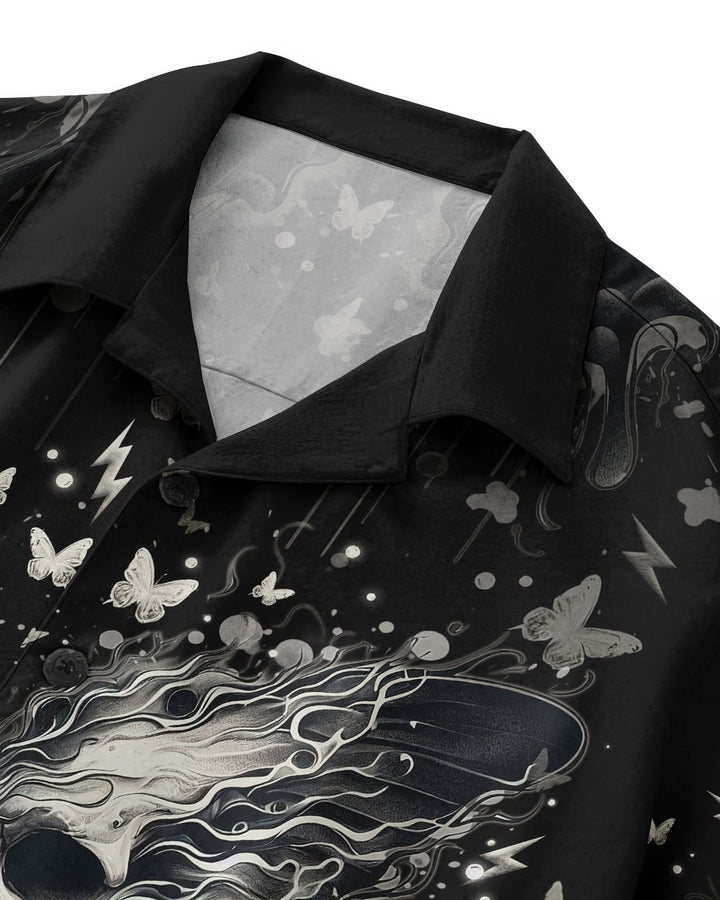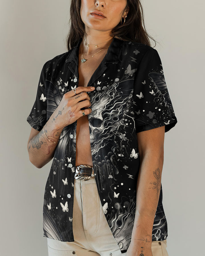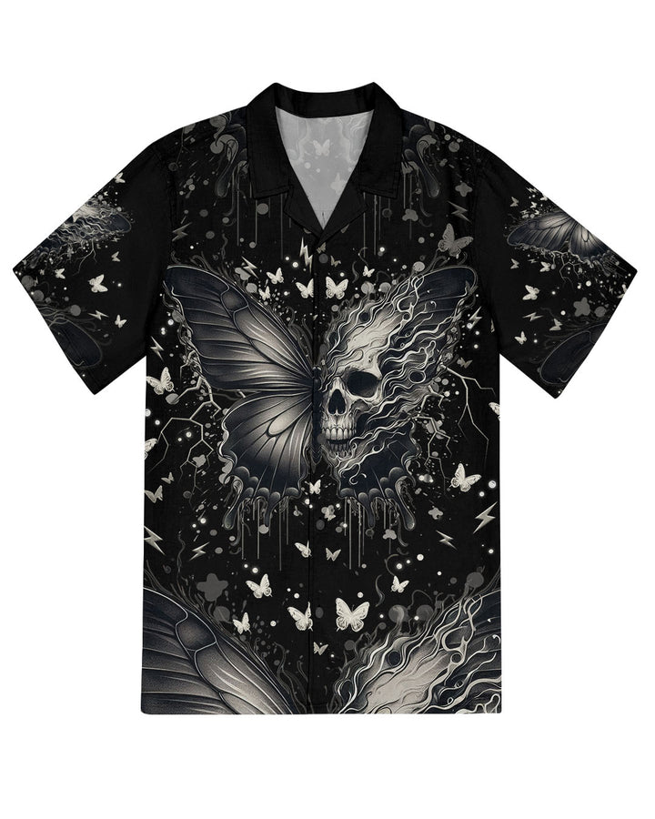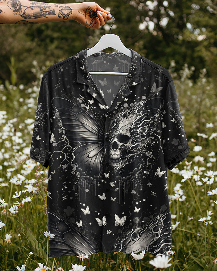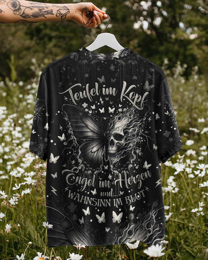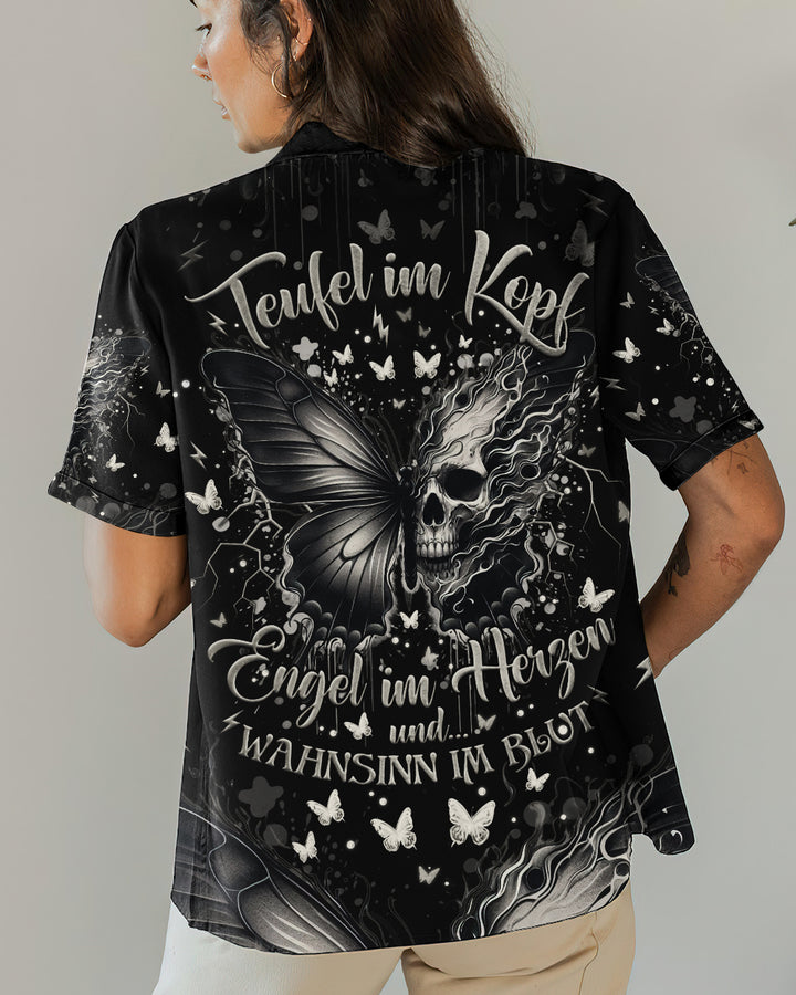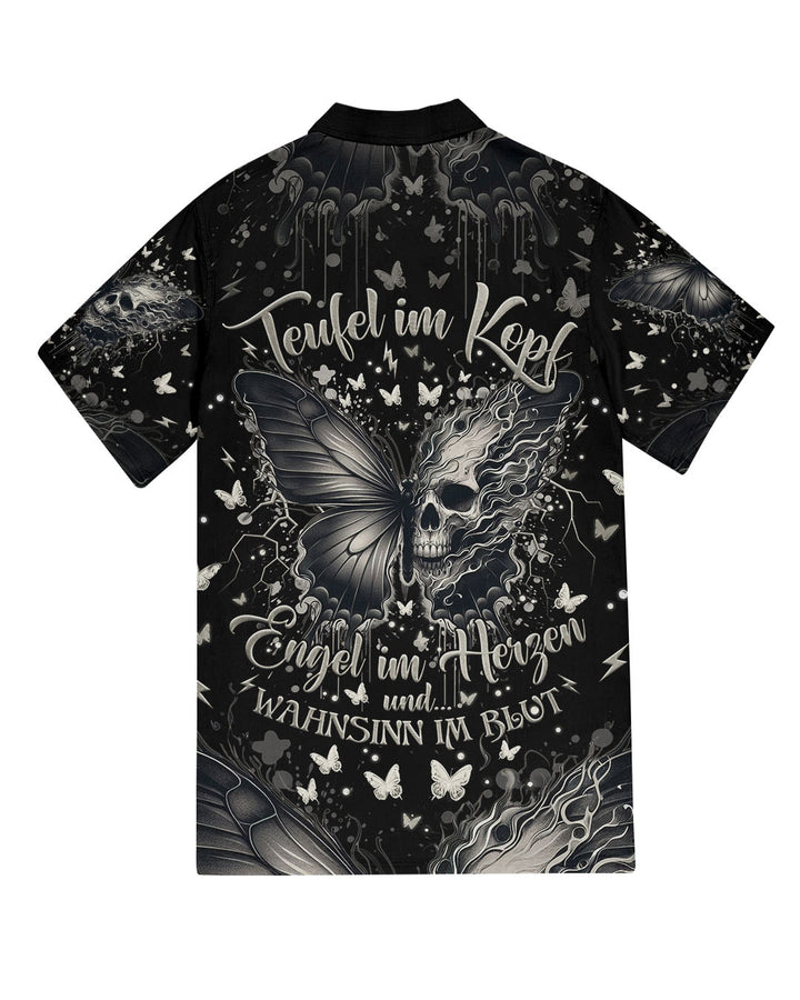 Das WAHNSINN IM BLUT Hawaiihemd zeigt ein einzigartiges Schmetterlingsschädel-Design, das die Dualität von dunklen Gedanken und sanfter Eleganz eindrucksvoll vereint. Die feurige Schädelgrafik steht symbolisch für ungezähmte Leidenschaft, während der Schmetterling für zarte Gefühle steht. Dieses Hemd bringt deine komplexe Persönlichkeit zum Ausdruck und lässt dich authentisch und unverwechselbar auftreten. Ideal für alle, die ihre intensive, widersprüchliche Natur stilvoll zeigen möchten.
